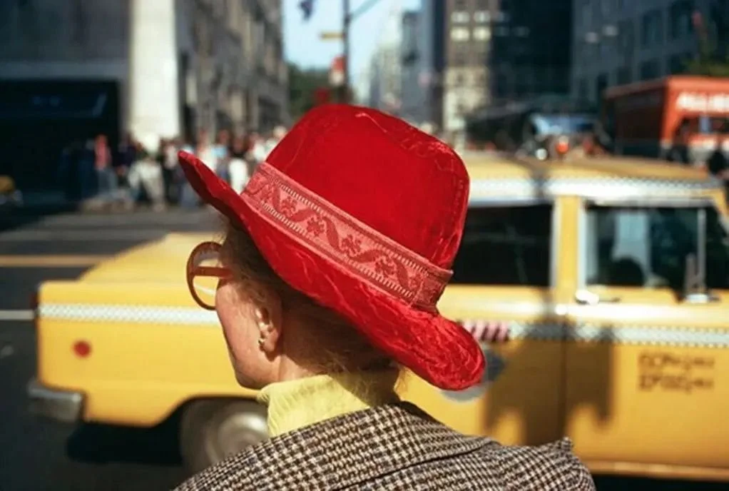 Joel Meyerowitz is another one. Especially in his early color work. He talks about setting a scene and letting life fill it. His compositions feel loose, but they are anything but random. There is a rhythm to them. He finds the right street corner or shaft of light and holds. A parked taxicab becomes prominent in the New York City traffic, a perfect color complement for a woman with a red hat.