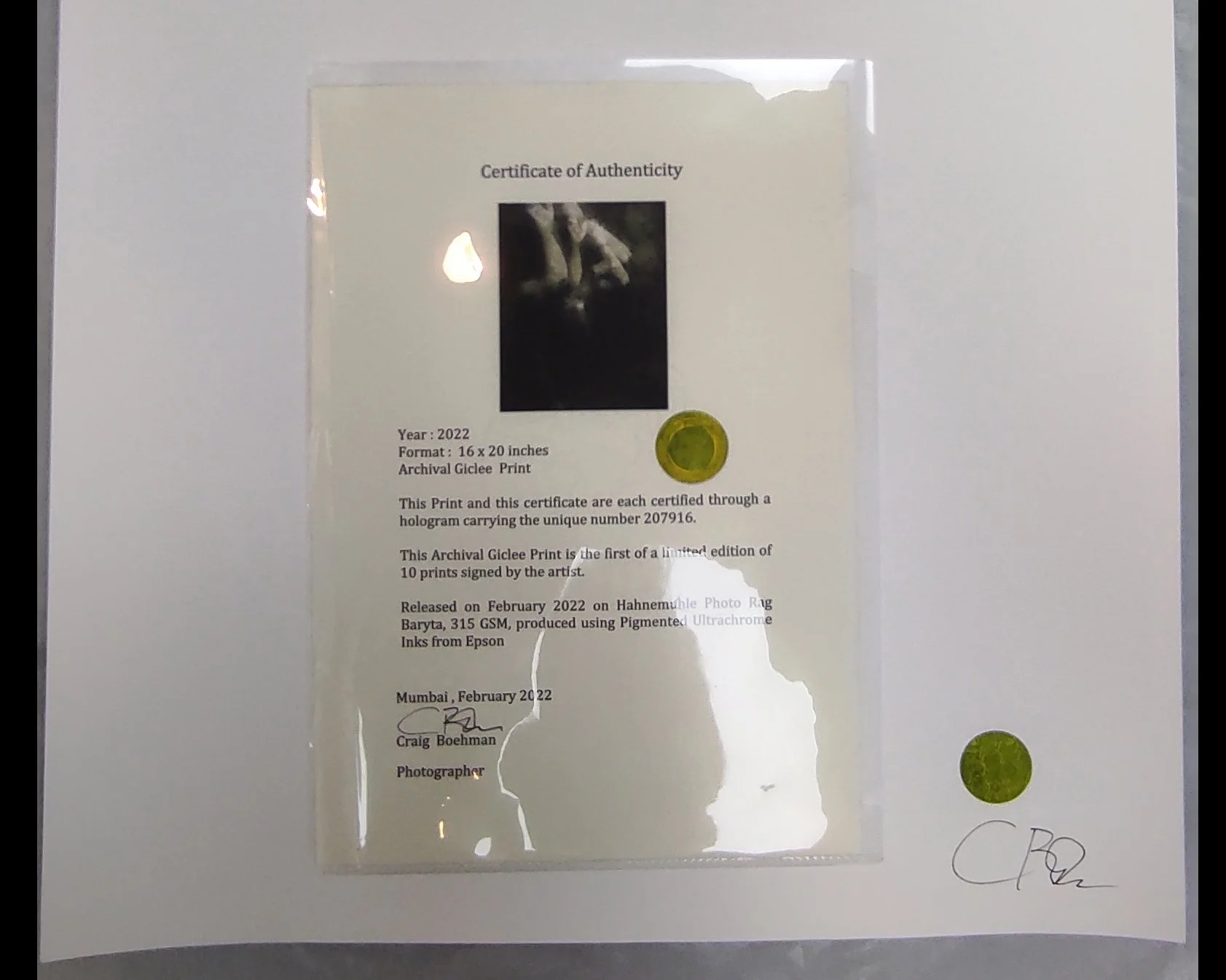 A Hahnemühle certificate of authentication for “Emergence”.